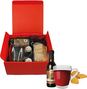 Nichts geht in der Advents- und Weihnachtszeit über ein gutes Glas heißen Glühwein. Dieser lässt sich mit unserem Set ganz einfach zuhause zubereiten. Einfach den Glühwein erhitzen und im beigelegten Teeglas zusammen mit den Butterspekulatius genießen. Das Set enthält: Glühwein 0,25 l, Teeglas, 100 g Butterspekulatius und 2 Rattan-Kugeln. Platz für den Werbedruck ab 250 Stück ist auf einer separaten Karte aus unserem Sortiment oder Ihre Beilage nach Wunsch.