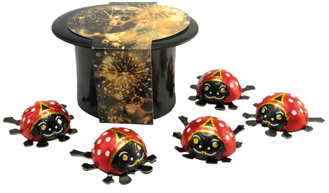 5 kleine Schokokäfer versüßen den Jahresausklang und verheißen viel Glück für das neue Jahr. Die Banderole kann im Standardmotiv mit Ihrem Werbeeindruck versehen oder, auch ab 250 Stück, individuell gestaltet werden. Inhalt: 5 Schokokäfer (je 6 g)