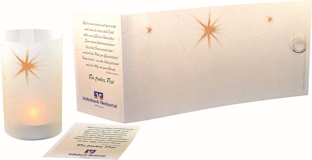 Diese Weihnachtskarte wird nachhaltig genutz. Nach dem Weihnachtsgruß wird sie einfach zusammengerollt und schmückt zusammen mit einem Teelicht jeden Raum (ohne Teelicht). Platz für den Werbedruck ist auf den Standardmotiven der Karte (Grußcoupon und Lichtrollenteil) oder eine eigene Gestaltung der Karte, jeweils ab 250 Stück. Ein Kuvert ist separat erhältlich Art. 6101 Inhalt: Lichtdurchlässige Weihnachtskarte mit Grußcoupon, perforiert (faltbar auf Lang-DIN) mit einer Metallklammer als Halterung für den gerollten Kartenteil (ohne Teelilcht) Warn- und Sicherheitshinweise: Kerze nicht unbeaufsichtigt brennen lassen und auf eine feuerfeste Unterlage stellen.