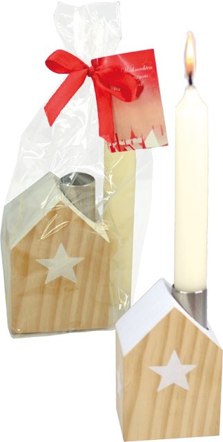 In einem kleinen Klarsichttütchen ist hier ein außergewöhnlicher Kerzenhalter aus Holz, in Form eines kleinen Häuschens, verpackt. Eine passende Kerze (ca. 180 mm) in weiß ist beigelegt. Das Anhängekärtchen bietet auf dem Standardmotiv Platz für den Werbedruck, ab 250 Stück. Eine eigene Gestaltung des Kärtchens ist ebenfalls ab 250 Stück möglich. Zudem besteht die Möglichkeit eines Tampondrucks direkt auf dem Holz-Häuschen, ab 100 Stück.