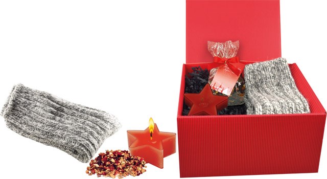 Dieser rote Präsent-Karton beinhaltet alles für einen gemütlichen Wintertag: ein paar warme, mollige Socken, eine rote Stern-Kerze sowie ca. 50 g Weihnachts-Früchtetee. So kann man es sich auf der Couch gut gehen lassen. Platz für den Werbedruck ist auf dem Standardmotiv des Anhänge-Kärtchens oder eine eigene Gestaltung des Kärtchens, jeweils bereits ab 250 Stück.