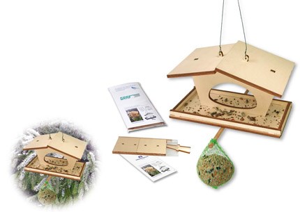 Das Bastel-Futterhäuschen mit Steckteilen aus Holz und einer Bastelanleitung, ist eingelegt in einer transparenten Hülle. Das Set enthält keinen Meisenknödel. Ein Tampondruck ist auf den Dachflächen des Futterhäuschens möglich. Platz für den Werbedruck ist auf dem Standardmotiv der Karte oder eine eigene Gestaltung, jeweils ab 250 Stück.