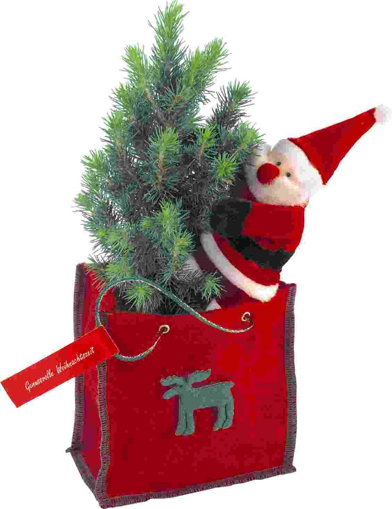 Eine lebende Zuckerhutfichte 20 - 30 cm mit magnetischen Weihnachtsmann verstaut in einer schönen roten Filztasche. Ein Werbegeschenk zu Weihnachten, über das sich jeder freut und das nachhaltig in Erinnerung bleibt. Bestens geeignet für die weihnachtliche Deko. Der Werbedruck (ab 250 Stück) ist möglich auf dem Standardmotiv des Anhängekärtchens. Eine eigene Gestaltung des Kärtchens ist bereits ab 250 Stück realisierbar. Inhalt: Bäumchen 20-30 cm, magnetischer Weihnachtsmann, Filztasche