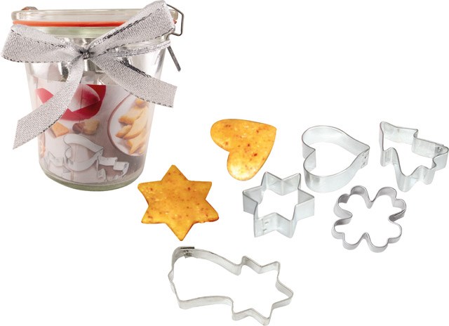 Inhalt: Weckglas (290 ml), 5 Ausstechformen, je ca. 5 cm (Tannenbaum, Herz, Stern, Komet, Kleeblatt), Rezept auf Einleger (ohne Gebäck)