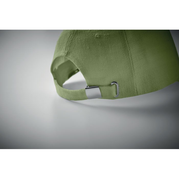 Baseball Kappe. 5 Panele. 100% Hanfgewebe 370g/m². Messing-Schnalle mit Einstecklasche. Fünf farblich abgestimmte, umstickte Belüftungslöcher. Größe 7 1/4.