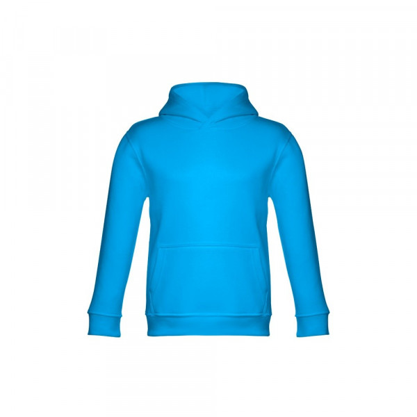 Kinder Sweatshirt aus 50% Baumwolle und 50% Polyester (320g/m²), unisex mit Kapuze in Jersey. Innen kardiert, Ripp 1x1 an Ärmelbündchen und Bund und einer Kängurutasche. Kapuze in Übereinstimmung mit den Sicherheitsstandards der Europäischen Union. Größen: 2, 4, 6, 8, 10, 12