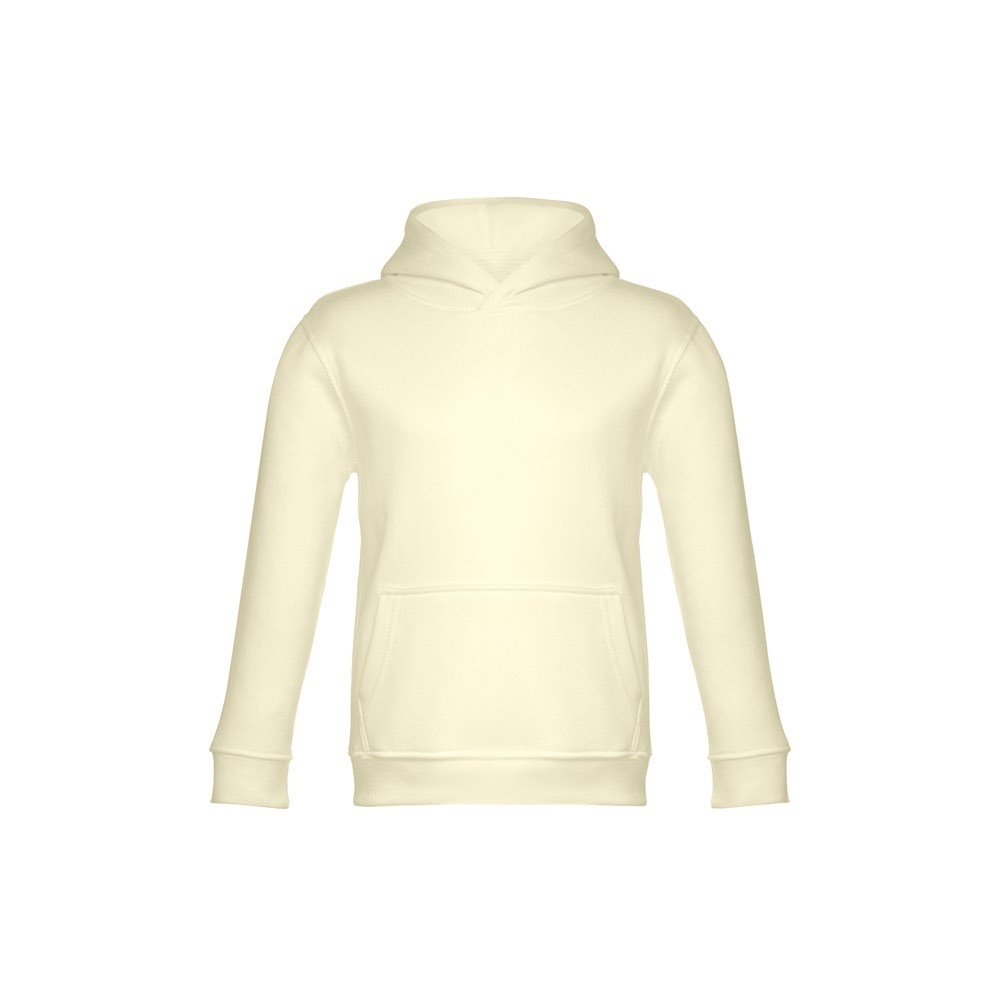Kinder Sweatshirt aus 50% Baumwolle und 50% Polyester (320g/m²), unisex mit Kapuze in Jersey. Innen kardiert, Ripp 1x1 an Ärmelbündchen und Bund und einer Kängurutasche. Kapuze in Übereinstimmung mit den Sicherheitsstandards der Europäischen Union. Größen: 2, 4, 6, 8, 10, 12