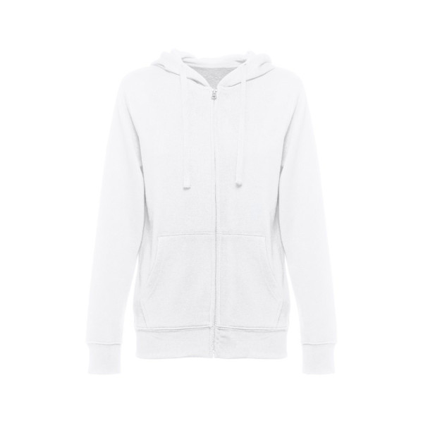 Damen Sweatshirt aus 50% Baumwolle und 50% Polyester (320 g/m²) mit kardierter Innenseite. Die Kapuze ist gefüttert und hat eine farblich abgestimmte Kordel. Auf der Vorderseite befinden sich 2 Beuteltaschen mit verdecktem Plastikreissverschluss. Ripp an Bund und Ärmeln. Größen: S, M, L, XL, XXL