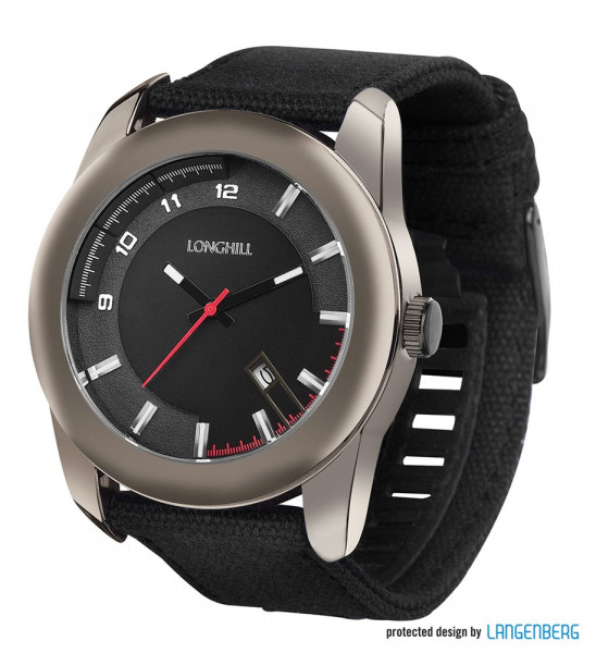 Ausstattung: Gehäusetiefe: 12 mm, Uhrwerk: PC 32 mit Datum, Zifferblatt schwarz, Index weiß, Zeiger schwarz, Sekundenzeiger rot, Gehäuseboden Edelstahl, 3 ATM water resistant , Nylonarmband 25 mm schwarz