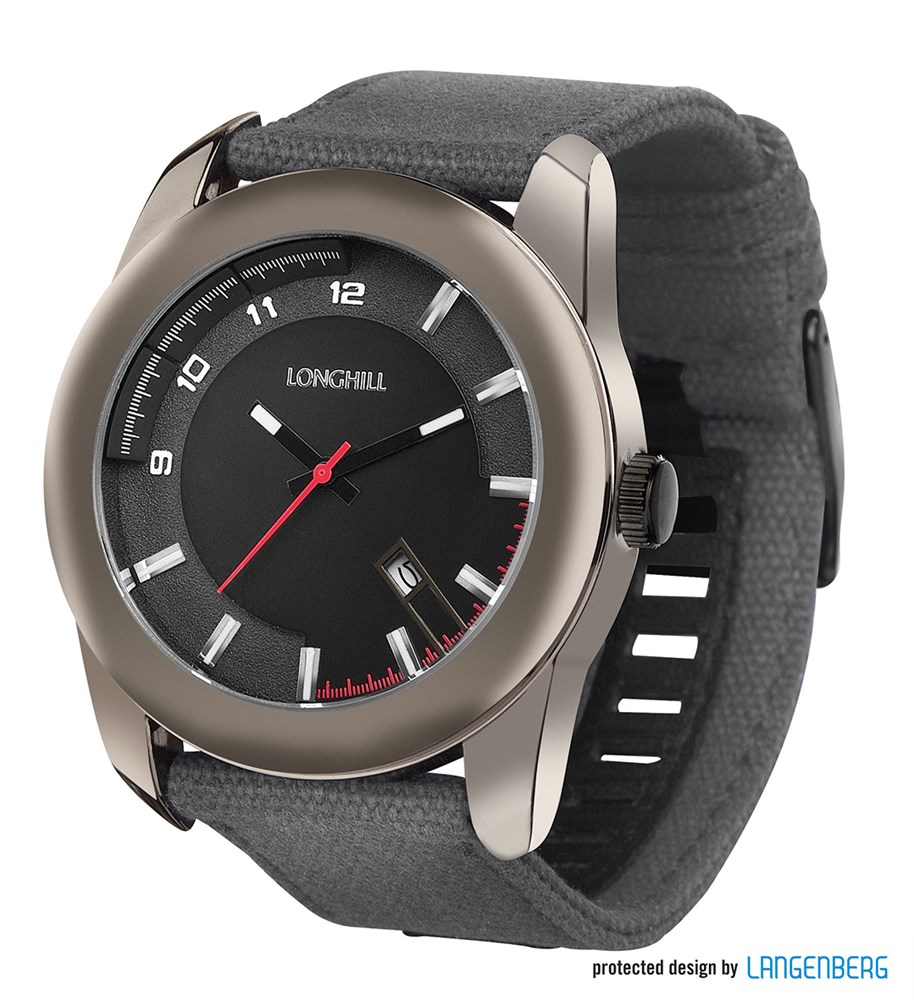 Ausstattung: Gehäusetiefe: 12 mm, Uhrwerk: PC 32 mit Datum, Zifferblatt schwarz, Index weiß, Zeiger schwarz, Sekundenzeiger rot, Gehäuseboden Edelstahl, 3 ATM water resistant , Nylonarmband 25mm grau
