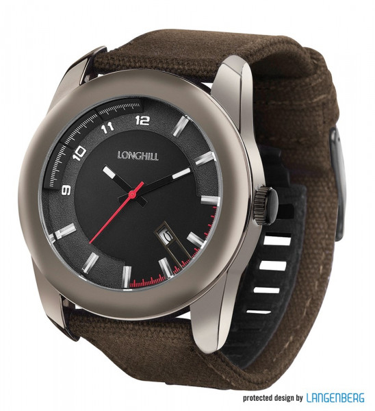 Ausstattung: Gehäusetiefe: 12 mm, Uhrwerk: PC 32 mit Datum, Zifferblatt schwarz, Index weiß, Zeiger schwarz, Sekundenzeiger rot, Gehäuseboden Edelstahl, 3 ATM water resistant , Nylonarmband 25 mm oliv