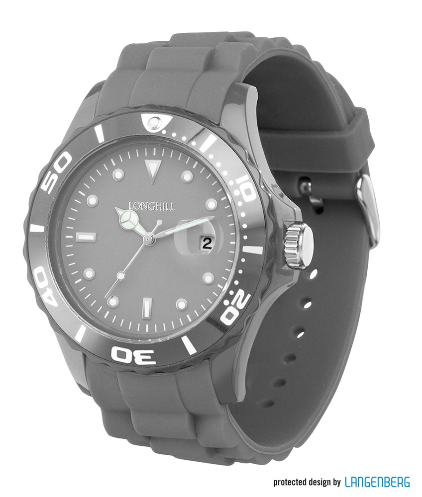 Ausstattung: Gehäusetiefe: 12,6 mm, Uhrwerk: PC 32, Zifferblatt grau mit Datum, Index Applikationen, Zeiger silber/leuchtend, Gehäuseboden Edelstahl, 3 ATM water resistant , Kunststoffarmband grau 22 mm