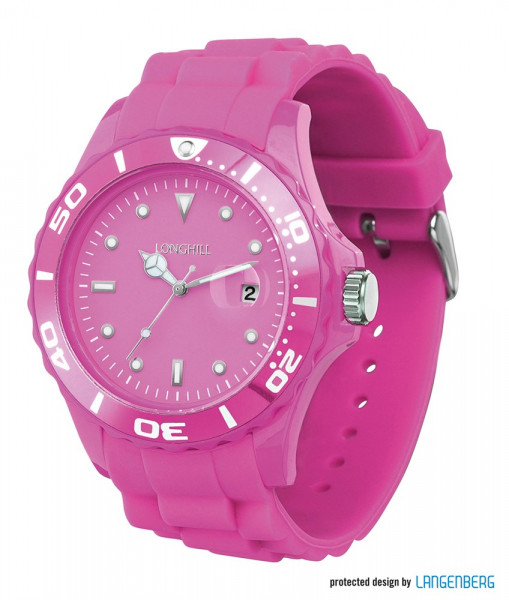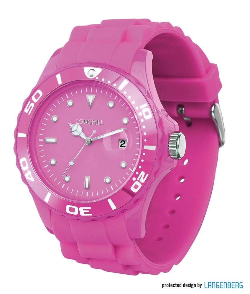 Ausstattung: Gehäusetiefe: 12,6 mm, Uhrwerk: PC 32, Zifferblatt pink mit Datum, Index Applikationen, Zeiger silber/leuchtend, Gehäuseboden Edelstahl, 3 ATM water resistant , Kunststoffarmband pink 22 mm