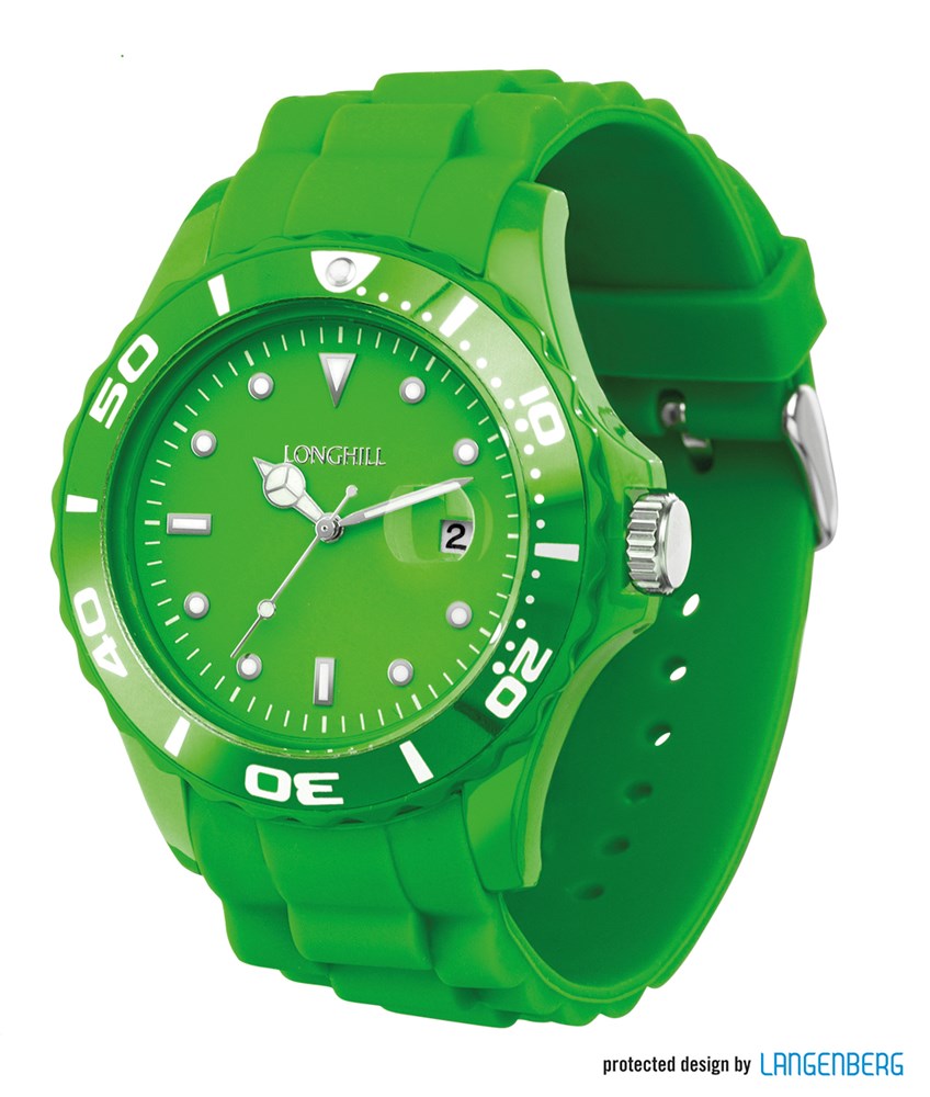 Ausstattung: Gehäusetiefe: 12,6 mm, Uhrwerk: PC 32, Zifferblatt grün mit Datum, Index Applikationen, Zeiger silber/leuchtend, Gehäuseboden Edelstahl, 3 ATM water resistant , Kunststoffarmband grün 22 mm