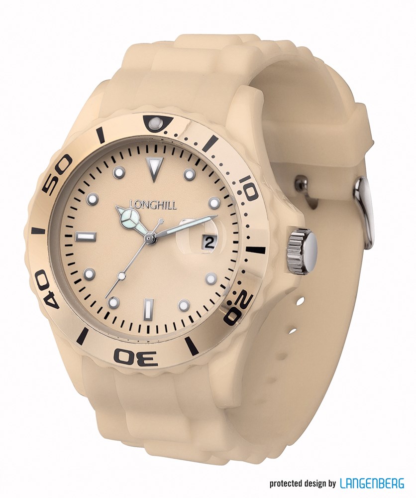 Ausstattung: Gehäusetiefe: 12,6 mm, Uhrwerk: PC 32, Zifferblatt sand mit Datum, Index Applikationen, Zeiger silber/leuchtend, Gehäuseboden Edelstahl, 3 ATM water resistant , Kunststoffarmband sand 22 mm
