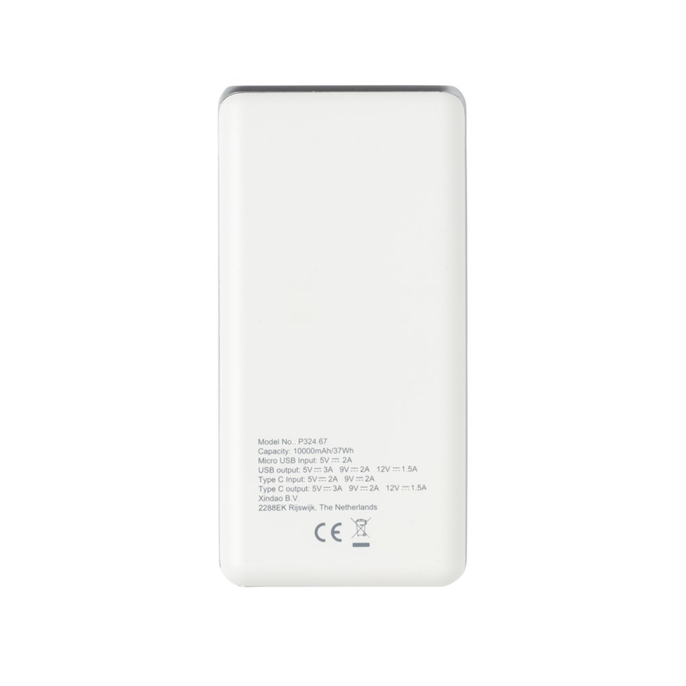 State-of-the-Art 10.000 mAh Powerbank mit ultraschnellem Output. Aus ABS und mit regulärem USB-Port sowie Type-C. Micro-USB Input: 5V/2A. USB Output: 5V/3A 9V/2A 12V/1.5A. Type-C Input: 5V/2A 9V/2A. Type-C Output: 5V/3A 9V/2A 12V/1.5A.